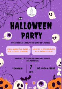 Réservez votre vendredi 7 novembre de 16h30 à 18h30. Halloween party organisée par l’APEL 😱😶‍🌫️👻🎃.